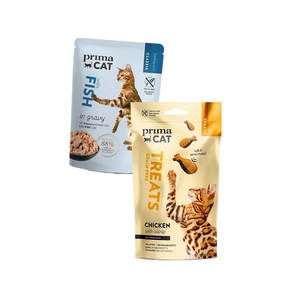 חבילת פינוקים שחתולים אוהבים, לרכישה או במתנה בקניית מוצר מהמשתתפים במבצע. תוכן החבילה אינו קבוע ומשתנה מעת לעת. החבילה כוללת 2 פינוקים ששויים במכירה רגילה כ-23 שח. התמונה להמחשה בלבד.