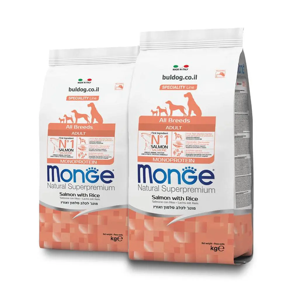 מזון לכלבים מונג’ בוגר סלמון ואורז 12 ק”ג – דיל 2 יח (24 קג)