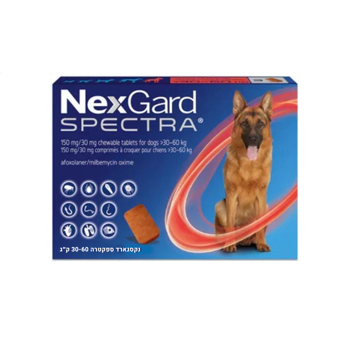 נקסגארד ספקטרה (NexGard SPECTRA) הוא תכשיר לעיסה חודשי מתקדם בטעם בקר, המעניק הגנה היקפית ורחבה נגד טפילים חיצוניים ופנימיים בכלבים. הוא מכיל שילוב של שני חומרים פעילים: אפורסולאנר (Afoxolaner) לחיסול פרעושים וקרציות, ו-מילבמיצין אוקסים (Milbemycin Oxime) לטיפול ומניעת תולעי מעיים ותולעת הפארק. הטבליה מתקבלת בקלות על ידי הכלב ומספקת הגנה רציפה למשך חודש שלם.