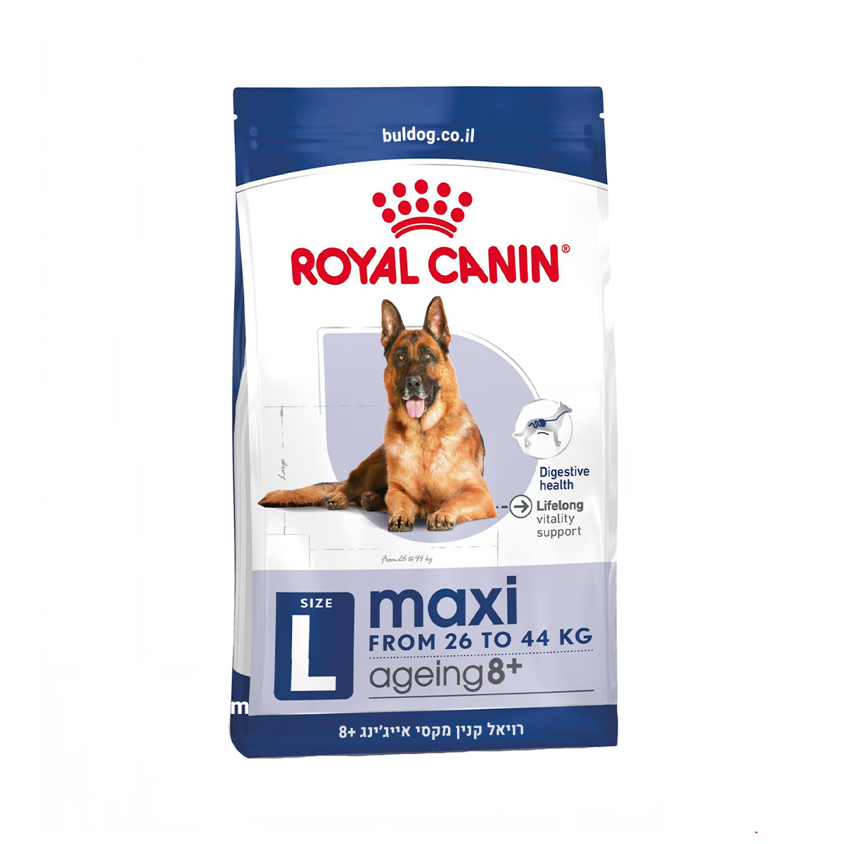 רויאל קנין מקסי אייג’ינג +8 – מזון יבש מלא לכלבים מבוגרים מגזע גדול (26–44 ק”ג), מגיל 8 שנים. מותאם במיוחד לצרכים התזונתיים של כלבים מזדקנים: תומך בניידות, חיוניות, עיכול בריא ותפקוד כללי מיטבי בגיל השלישי.