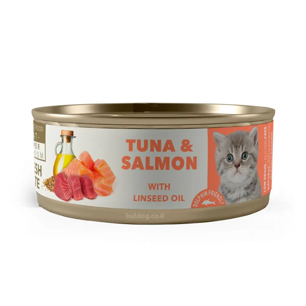 מזון רטוב לגורי חתולים במרקם פטה בטעם טונה וסלמון.