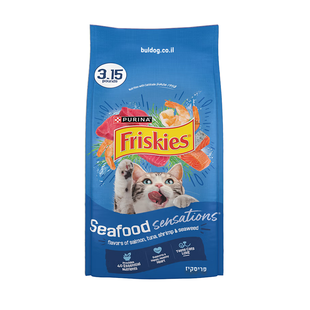 פריסקיז מעדני הים – מזון יבש מלא לחתולים בוגרים בטעם סלמון, טונה, סרטנים ואצות ים. פורמולה עשירה בטעמים אהובים מהים, בתוספת אצות, ויטמינים, מינרלים וטאורין – לתמיכה בבריאות הפרווה, העיניים, הלב ומערכת החיסון.